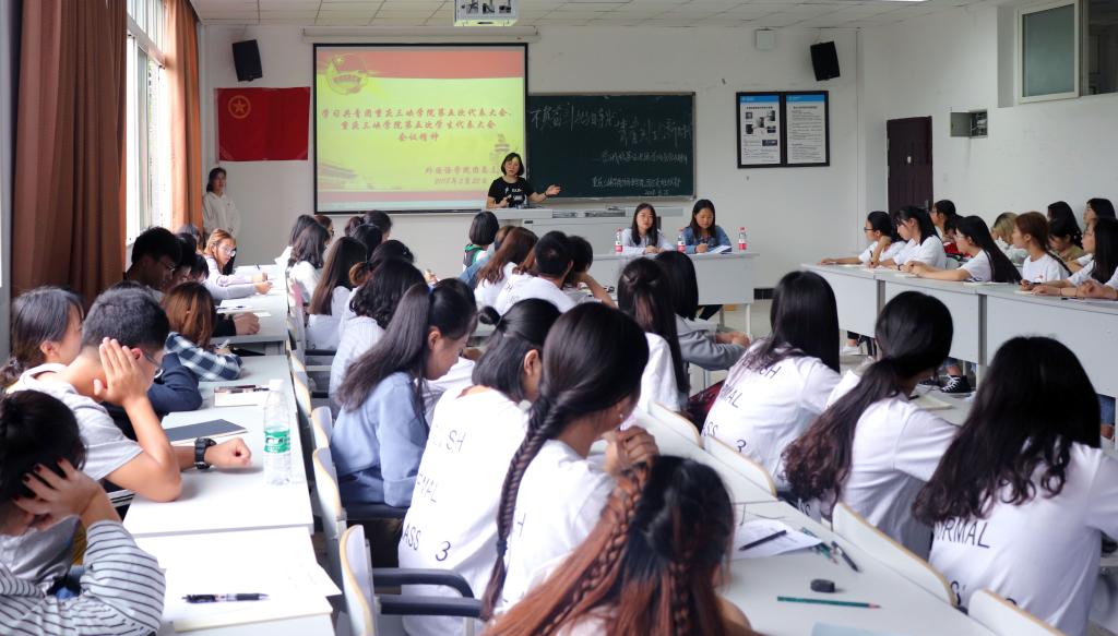 5月25日16:30,外国语学院团总支组织全体团学干部在一教219教室学习校第五次团学代表大会重要精神。外国语学院党总支副书记黄琰、团总支书记杨华、2017级辅导员任红营老师出席了本次活动。