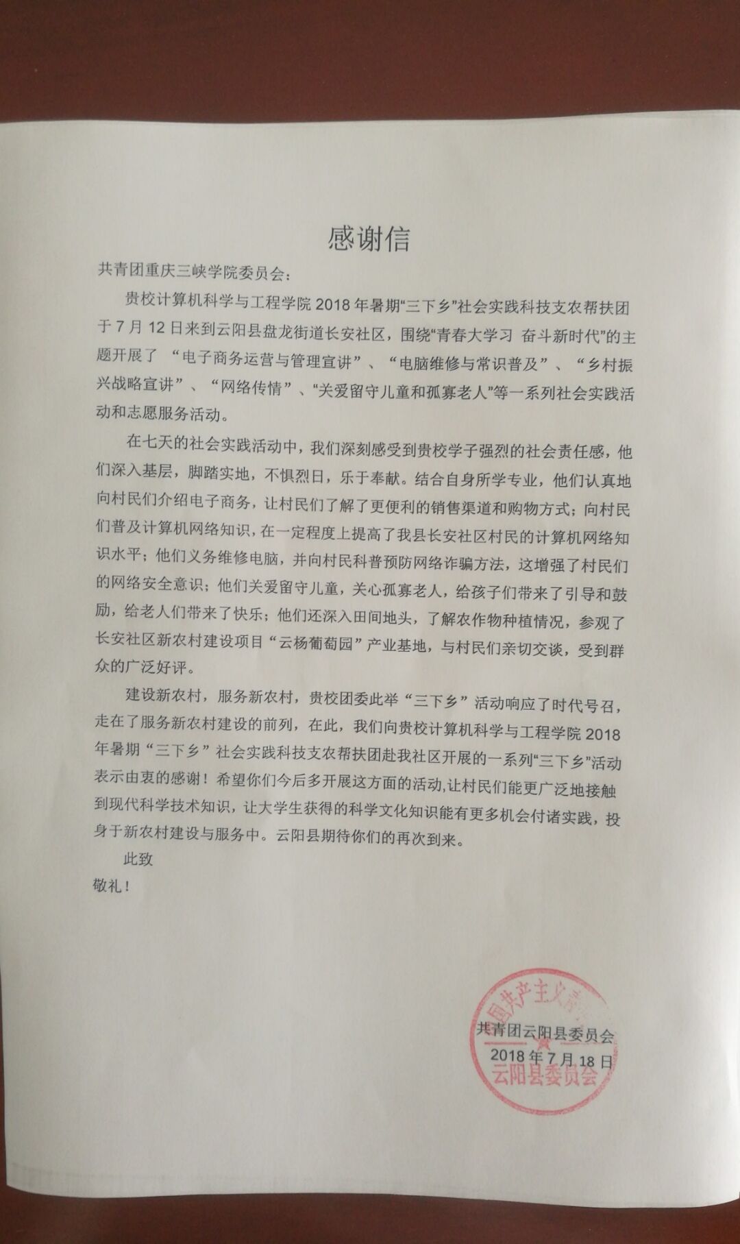 7月18日上午,云阳县团委领导周树荣副书记专程邀请我校计算机科学与工程学院暑期“三下乡”社会实践“科技支农”帮扶团到云阳县委办公室,将一封诚挚的感谢信交到帮扶团手中。“衷心感谢重庆三峡学院培养了这么多优秀的同学,同时感谢你们不惧烈日为长安社区的村民们带去科技知识”,信中这样说到。云阳县团委对帮扶团高度的社会责任感、热忱的宣传态度和吃苦耐劳精神表示衷心的感谢。最后,周树荣副书记与帮扶团成员代表进行了合影留念。
