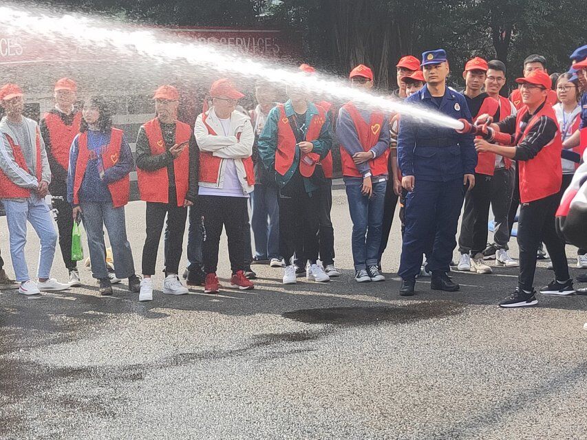 最后,消防队员们邀请志愿者穿上消防队服去体验用高压水枪和灭火器去灭火的感受,这些体验让志愿者们感受了消防员的艰辛与不易。在消防救灾犬表演了救生技能后,活动接近尾声。志愿者集体合影之后有序地离开了现场。