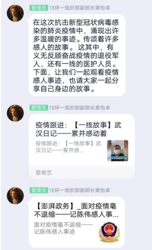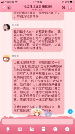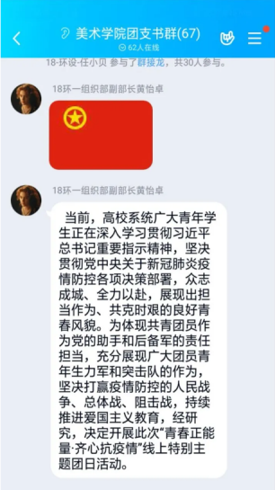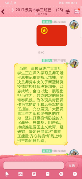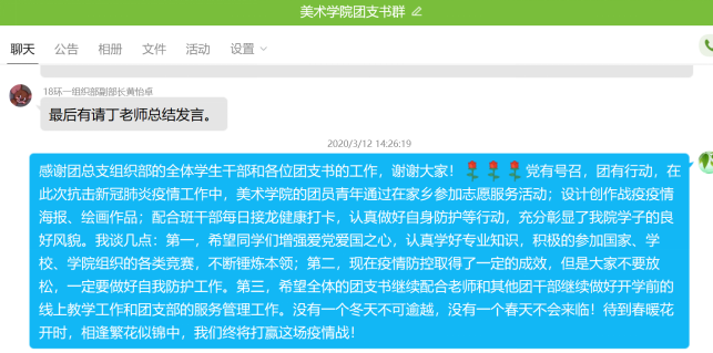 下午2点,在学院团总支组织部部副部长黄怡卓的组织下,美术学院全体团支书以群接龙的方式进行签到,线上团日活动有序的开展起来。第一个话题是同学们观看疫情感人事迹视频,分享自己身边的故事。全体团支书就各自身边发生的感人抗疫事件进行分享。在这次抗击新型冠状病毒感染的肺炎疫情中,涌现出许多温暖的事迹。传颂着许多感人的故事。 这其中,有一线的医护人员、建筑人员、警察以及其他各个职业的、默默奉献的人们。这种“舍小我,为大家”的精神,值得每一位青年学生学习。陈昱君同学谈到:疫情从春节前就开始了,到现在疫情得到了很有效的控制。每一天一醒来就是拿起手机打开微博关注此次疫情又有多少疑似、新增、死亡病例,每一天看着人数增加,心里在默默的为他们祈祷。紧接着是第二个话题的讨论,如何有效预防新型冠状病毒。疫情防控,从点滴做起。牢记:必戴口罩、拒食野味、勤快洗手、减少串门、拒绝谣言。每一个人都积极发言,分享自己的防疫妙招,每一个人都在为打赢这场战“疫”,奉献自己的一份力。