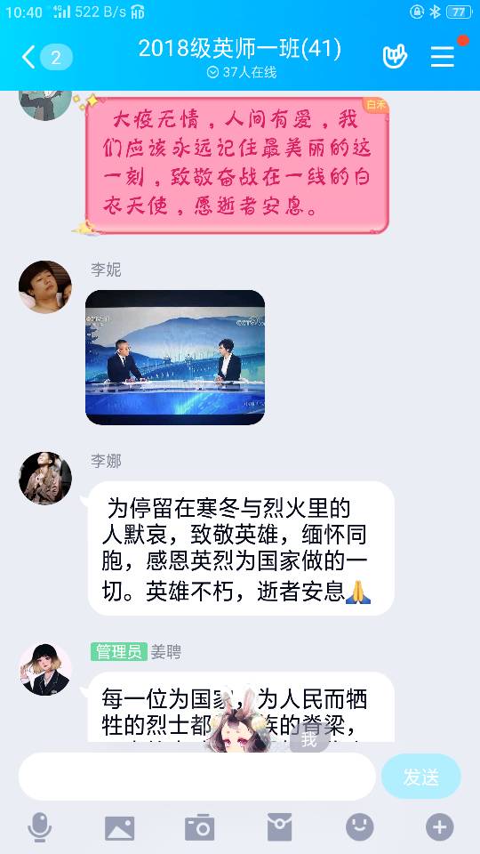 2018级日语班同学也分享道:“他们是英雄,他们是勇士。他们用行动,用身躯,筑起了保卫祖国的万里长城。正是有他们,这群背负了保卫人民的任务,毅然决然向防疫一线前行的逆行者,正是有他们,我们才能在家安然度过这个特殊的春节。向逆行者们致敬!向烈士们致敬!”是的,所有一线人员的付出与牺牲都不会被遗忘,历史不会忘记,家国不会,我们也不会。