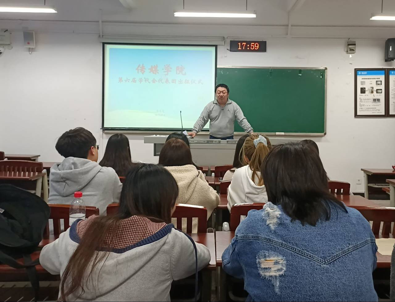 10月22日下午五点半,传媒学院第六届学代会代表团出征仪式在明辨楼1教314教室顺利举行,出席本次活动的有团总支书记姜博洋以及传媒学院7位学代会代表。