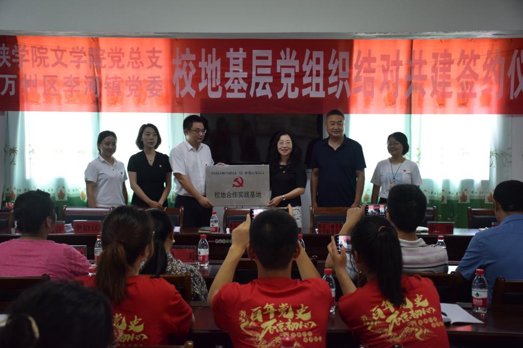 7月14日上午,重庆三峡学院文学院党总支与万州区李河镇党委于当地政府二楼会议室成功举行校地基层党组织结对共建签约授牌仪式。李河镇党委副书记、镇长李沿江、党委宣传委员屈发丽、组织委员冯玉萍、重庆三峡学院文学院党总支书记唐晓萍、副书记姜希、副院长李俊及相关负责人员参加本次仪式。