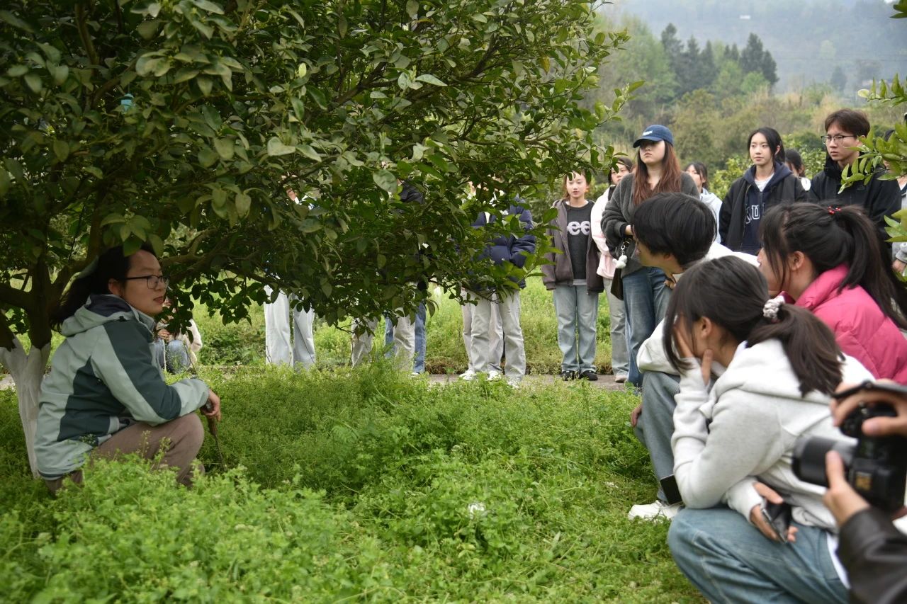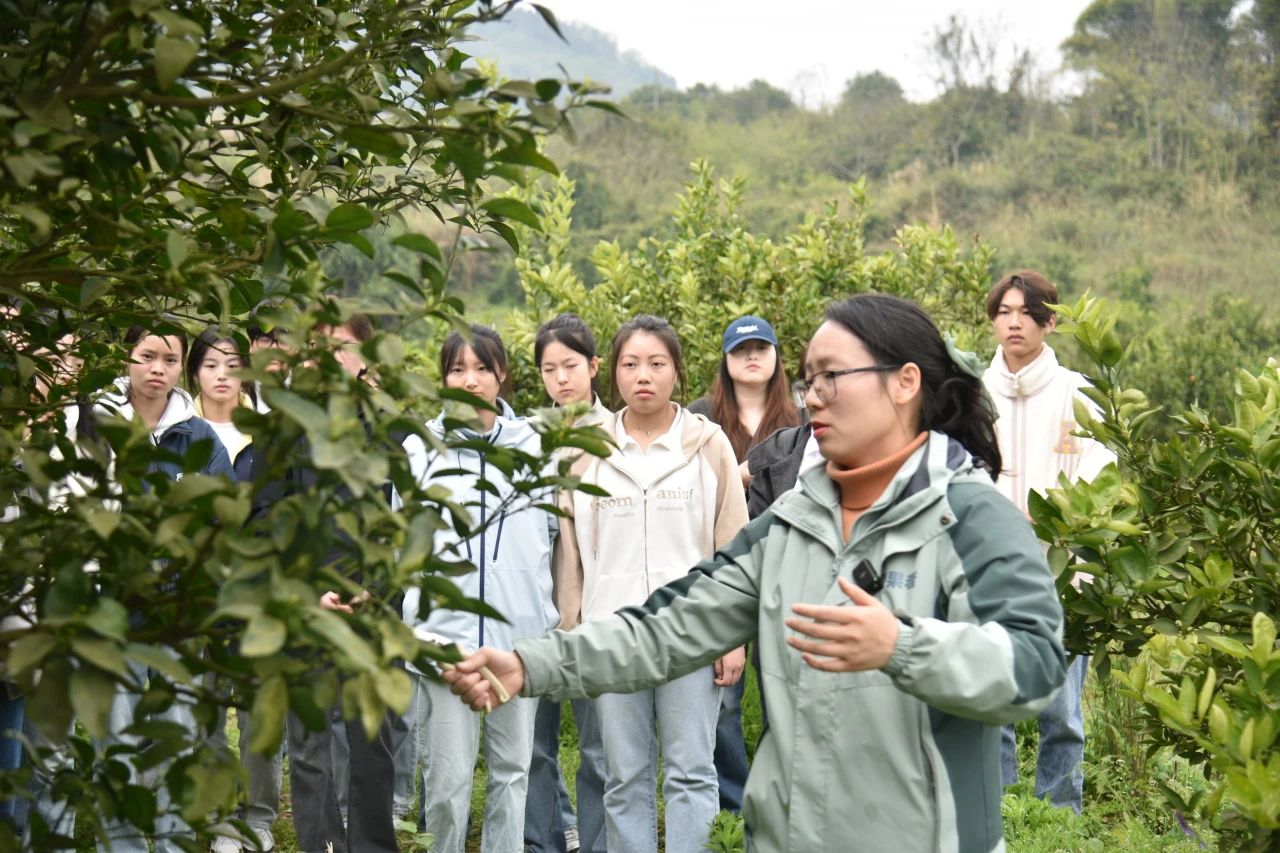马晓丽老师带领同学们参观柑橘实验田,通过现场演示的方式为大家展示了玫瑰香橙改良的成果。她以自身经验呼吁同学们践行重庆城市精神,以敢为人先的勇气积极开展科研创新和农技推广,服务特色产业发展,助力乡村全面振兴。