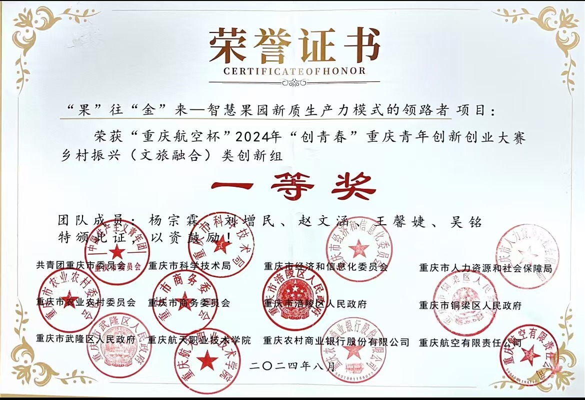 “重庆航空杯”2024年“创青春”重庆青年创新创业大赛乡村振兴(文旅融合)类创新组一等奖