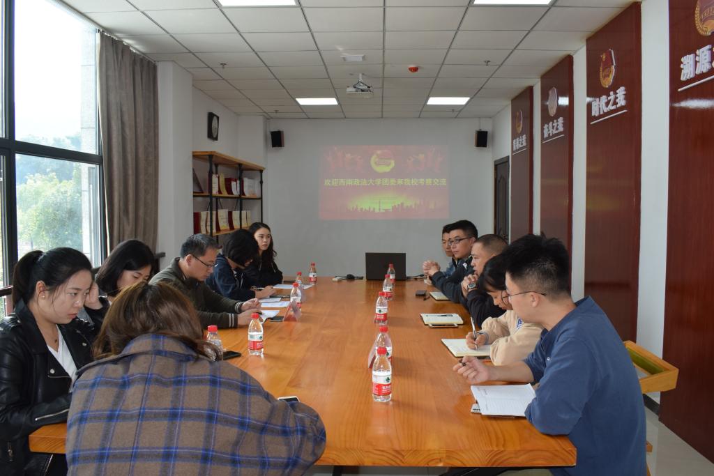 10月10日上午,西南政法大学团委副书记李瑶一行6人来我校考察交流,团委书记黄宇,各科室负责人及主要团学干部参加相关活动。