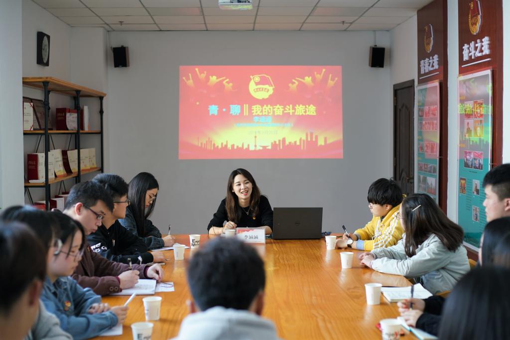 3月20日下午,我委2019年第1期“青•聊”活动在科技楼402室轻松开聊。我校2016届美术学(师范类)专业优秀校友,团十八大代表、第十八届共青团中央委员会候补委员,重庆市第五届青联委员,重庆市煜昆青少年发展服务中心主任李涵涵学姐作为嘉宾专程回校与学弟学妹分享自己的奋斗旅途,为大家答疑学习、工作、生活中的困惑。