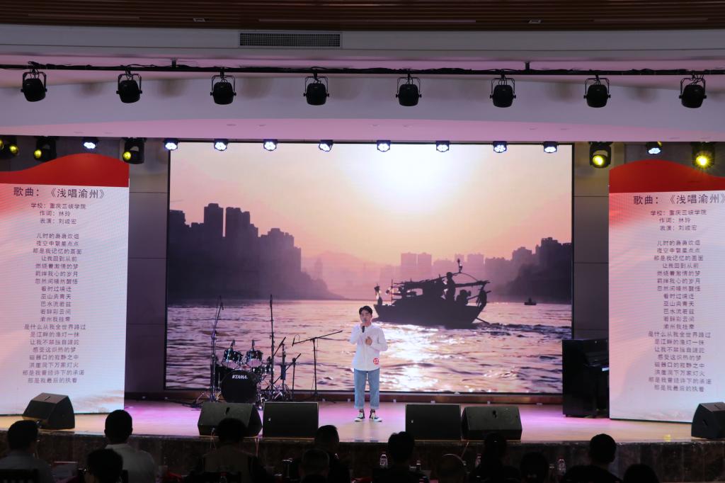 本次“放歌新时代”原创歌曲大赛历时一个多月,共吸引了全市多所高校百余名青年大学生报名参与,历经紧张激烈地角逐,25件原创歌曲晋级决赛。决赛在配乐朗诵《爱国是一首奋斗的歌》中拉开帷幕,全场师生挥舞小红旗,高呼“我爱你,中国”,将现场热情点燃。参赛选手们个个精神饱满、彰显青春活力,来自重庆邮电大学移通学院选手漆一瑾、李俊琦全新编曲《琵琶梦》;来自重庆大学选手谢丛宇、唐雪菲深情演绎歌曲《石头门》;我校刘峻宏选手演唱的《浅唱渝州》和向银川演唱的《光影》,用音乐的方式唱出渝州大地的独特,深情地表达了对家乡的热,优雅的声音娓娓道来,缓缓叙说的演唱风格也同样让现场观众动容,气氛高涨。整场比赛,各组选手实力相当,不遑多让,演唱作品可谓精彩纷呈。