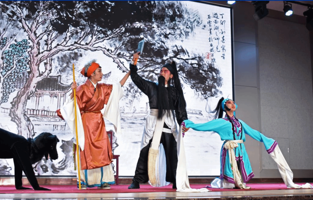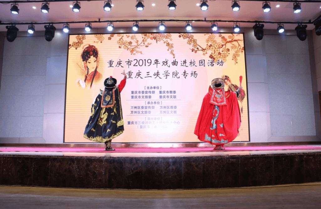 本次活动由重庆市三峡川剧艺术研究传承中心(重庆市三峡川剧团)主演。戏曲现场表演具有很强的带动感,本次戏曲演出中,由陈姗、向倩、江春节、郭新山主演的川剧弹戏《杀狗惊妻》,贺繁荣、赵然主演的川剧集粹《变脸·吐火》,谭杨兵、刘婷婷、江春节主演的川剧高腔《放裴》,谭继琼、潘文建、赵然等主演的现代川剧《白露为霜》。演员们大展身手,唱念做打粉墨登场,乐队伴奏有板有眼,为观众呈现了一场精彩绝伦的表演,同学们掌声此起彼伏。
