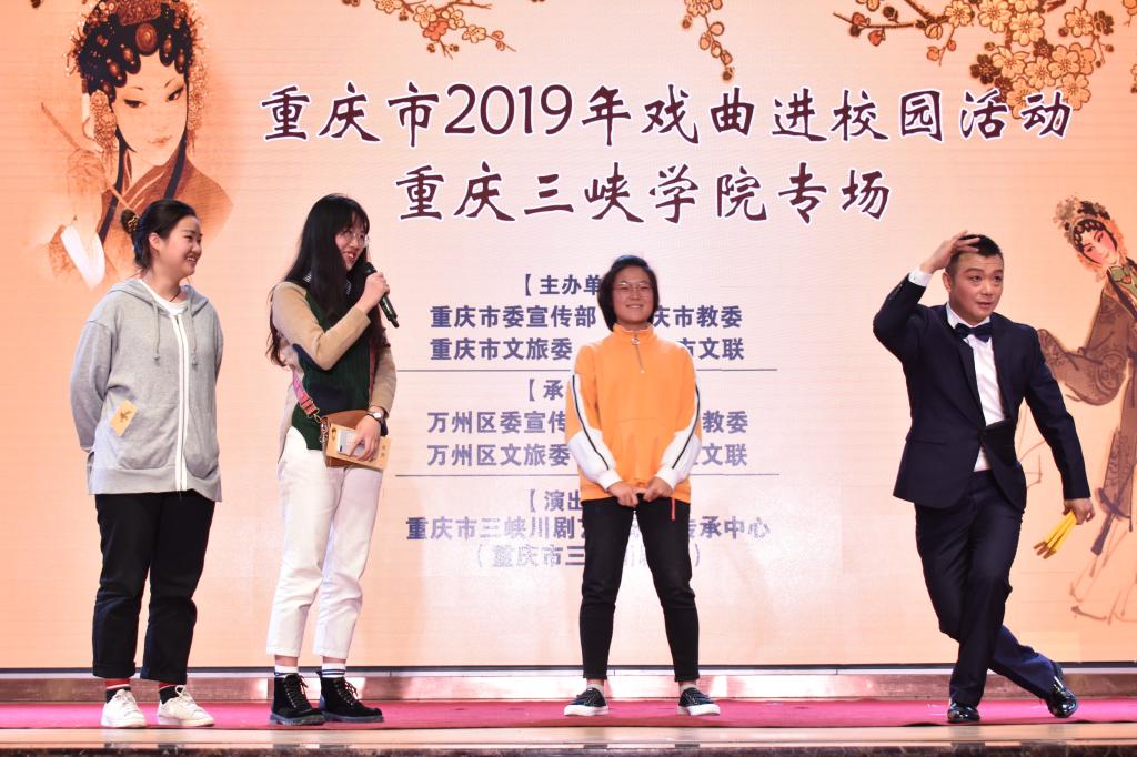 为弘扬中华优秀传统文化,增强文化自信。11月4日,由市委宣传部、市教委、市旅委、市文联开展的2019年戏曲进校园活动——重庆三峡学院专场,在我校桂花苑食堂三楼多功能厅举行。学校党委书记李廷勇莅临现场与500余名师生共同观看此次演出。