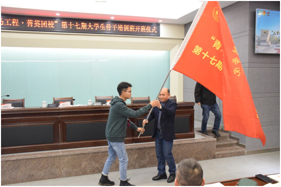 开班在庄严肃穆的国歌声中拉开序幕:陈孝胜宣读学校第十七期“大骨班”相关文件,阐明此次大骨班的培训时间、培训对象、培训方式、选拔方式及相关要求;来自生工学院的雷承霖同学作为学员代表发言;崔广平副书记为本期“大骨班”授旗并宣布开班!