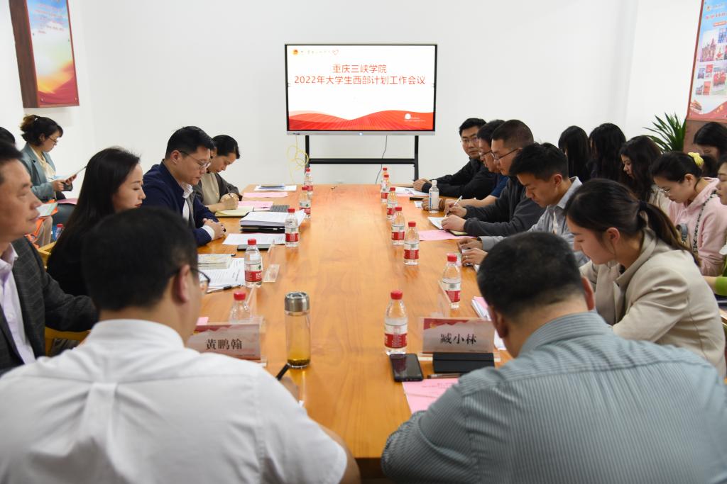 为进一步做好大学生志愿服务西部计划工作,号召更多的青年到基层到西部去受教育、长才干、做贡献,我校于4月22日下午在众创空间103召开了2022年大学生志愿服务西部计划工作推进会。党委常委、副校长臧小林,万州团区委副书记黄鹏翰,万州团区委青少部负责人李施雨,学校招就处处长曾继平,团委书记熊贞贞,以及各二级学院团总支负责人、毕业班辅导员参加了本次会议。校团委副书记王峰主持会议。