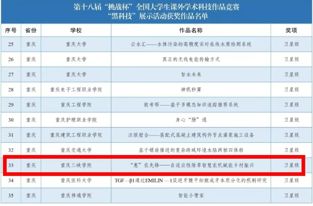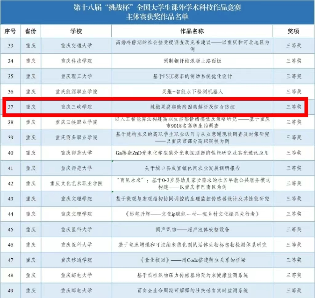 近日,由共青团中央、中国科协、教育部、中国社会科学院、全国学联和贵州省人民政府共同主办,贵州大学承办的第十八届“挑战杯”全国大学生课外学术科技,决寒结果揭晓,由青年教师芮璐指导,生物与食品工程学院2020级农学徐嘉茂等同学参与的项目《辣椒果腐病致病因素解析及综合防控》荣获主体赛三等奖;由青年教师罗强、吴小霞指导,机械工程学院2021级机械设计制造及其自动化专业韩彬等同学参与的项目《“惠”农先锋——自适应性除草智慧农机赋能乡村振兴》在“黑科技”展示活动获“卫星级”。