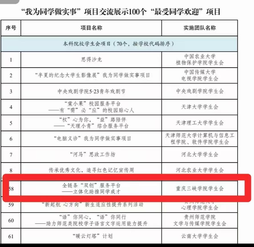 我校学生会“全链条‘双创’服务平台——立体化助推同学成才”项目,经学校推荐、省内推报、全国遴选,在全国1700多所高校、3500余个项目中脱颖而出,成功入选全国300个优秀项目,参加交流展示活动。在学校党委、团委的关心指导下,学生会共同努力、积极准备,取得了可喜成绩。通过项目集中展示、校园路演、现场答辩等环节,不仅获评全国高校学生会组织“我为同学做实事”优秀项目,也获评全国高校本科生学生会“最受同学欢迎项目”(全国70个)。