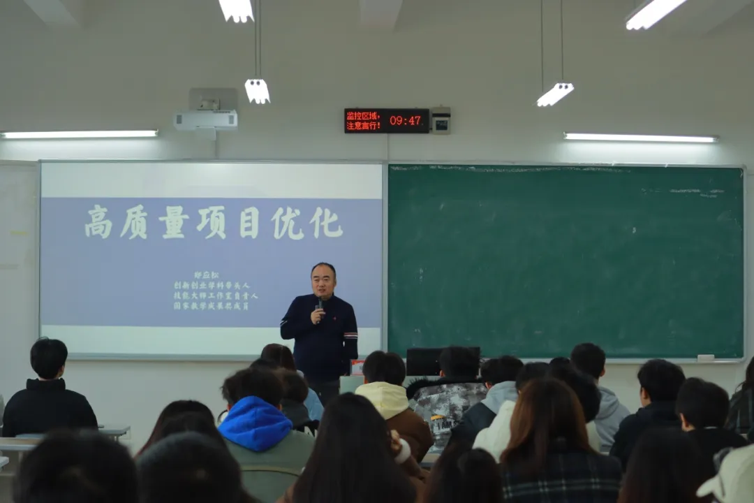 郑老师特别提出了“以战养战”的战略,即鼓励同学们多参加各类比赛,通过实践积累经验,并不断优化自己的项目。通过比赛积累的经验,将为同学们未来的创新创业打下坚实的基础。此外,郑老师还针对“挑战杯”项目的材料修改与优化提出了宝贵的建议,帮助同学们提升项目的整体质量,使他们更有信心迎接接下来的各项挑战。