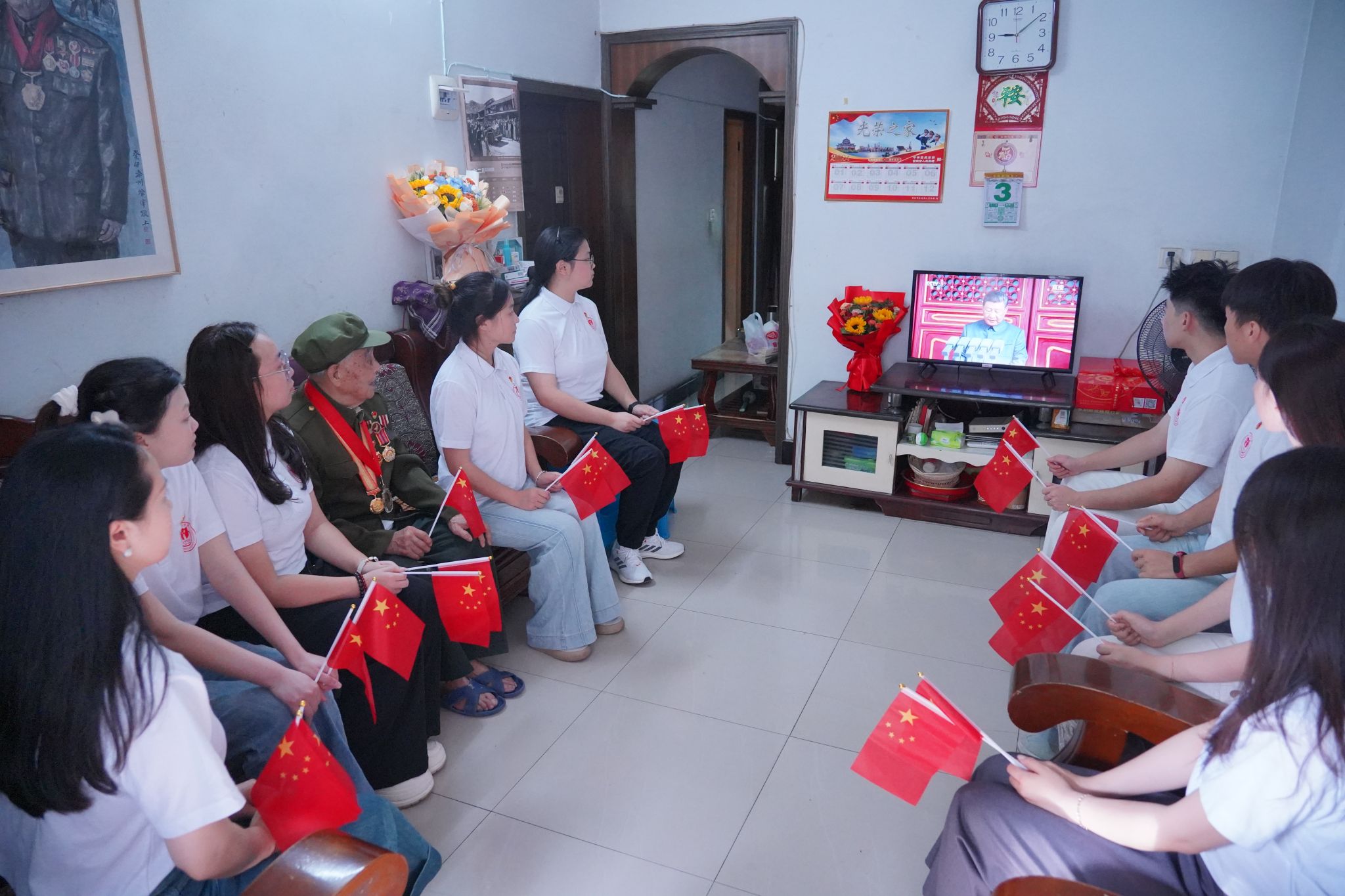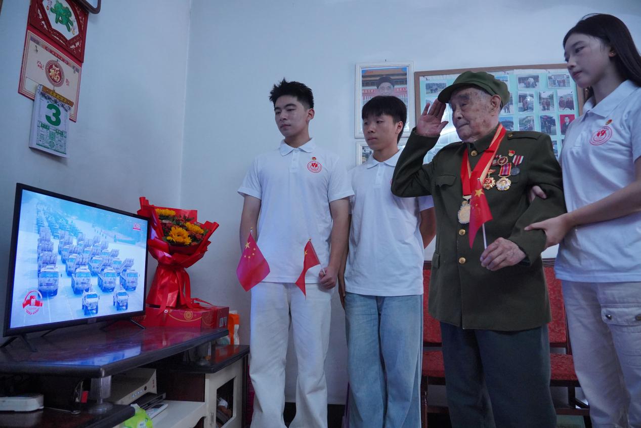 9月3日上午,在重庆市万州区天海苑社区,校团委组织十名青年师生代表来到101岁抗战老战士喻良科家中,与这位历经烽火岁月的老兵一同观看纪念中国人民抗日战争暨世界反法西斯战争胜利80周年阅兵仪式。