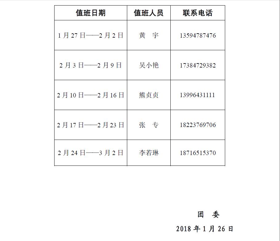 团委2018年寒假期间值班表