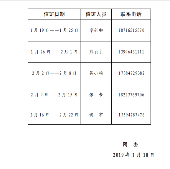团委2019年寒假期间值班表